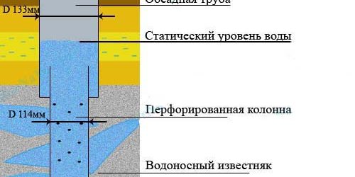 Для обустройства такой скважины требуется одна металлическая труба для обсадки, которая также выполняет роль эксплуатационной. Пробурить скважину без дополнительных труб возможно, если в известняке нет глиняных и песчаных прослоек.