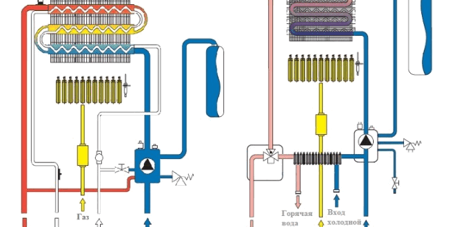 Для полноценного жизнеобеспечения жилого объекта привлекательнее выглядит двухконтурные газовые котлы, которые, кроме отопления, обеспечивают функционирование системы горячего водоснабжения, используя для этого второй свой контур. Двухконтурные обогревательные устройства различаются по способу нагрева теплоносителя: