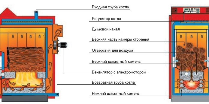 Водонагреватели длительного или верхнего горения используют другой способ загрузки топлива – сверху. За счет этого происходит полное прогорание и увеличивается эффективность.