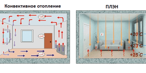 Они способны нагреть лишь поверхности из твердых материалов. То есть сначала в результате работы системы отопления ПЛЭН происходит нагрев мебели и отделки в комнате, а затем уже они отдают тепло воздуху.