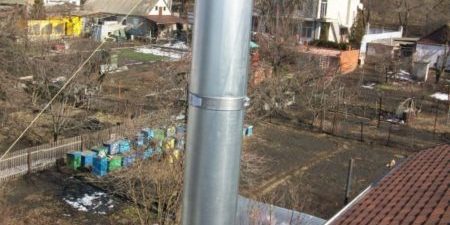 Дымоход проще сделать из трубы. Можно взять обычную толстостенную стальную — она дешевле, пропустить её через крышу и вывести на полметра выше самой высокой точки крыши. Сейчас в продаже имеются готовые сборные элементы, которые собираются с помощью замковых соединений. Всё, что для него нужно — это сваренные из профиля держатели. Такой сборный дымоход пригоден как для выведения через стену с коленным изгибом, так и через крышу. Первый вариант сделать легче.