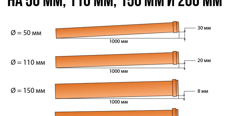 - На один погонный метр у трубы с диаметром до 50 мм, нужно выделять по 3 см уклона, но при этом у трубопроводов с диаметром 110 мм понадобится 2 см;