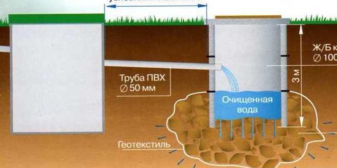 Существует бассейн для очистки с двумя камерами, составленный по системе Ратникова: он утилизирует сточные воды в почву после их прохождения через отстойник или переливную емкость. Данный септик из бетонных колец можно создать своими руками на даче. Его схема выглядит так: