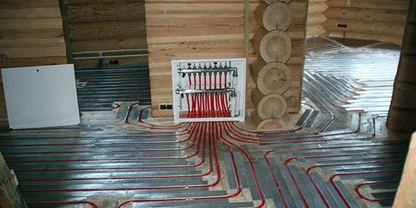 Принцип устройства подогреваемого водой пола следующий: к отопительному котлу или системе центрального отопления подключаются трубопроводы, по которым горячая вода подается в систему уложенных спиралями по перекрытиям труб, а отвод отдавшей тепловую энергию воды осуществляется по обратному трубопроводу снова в отопительную систему.