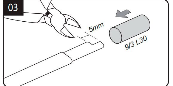 Одеваем термотрубку на кабель и сдвигаем ее в сторону. Вставляем оголенные провода в соединительные гильзы с термоусаживаемой трубкой и обжимаем их щипцами или плоскогубцами: