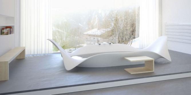 - Если ванная комната имеет большую площадь и владелец мечтает о просторной купели – стоит выбрать акриловую конструкцию. Форма может быть любой, а лёгкий и прочный пластик выдержит максимальный объём воды.
