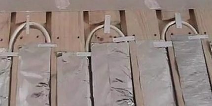 Чтобы листы не сдвинулись с места, их фиксируют к рейкам с помощью степлера. Для лучшей теплоотдачи желательно трубы перед укладкой обернуть такой же фольгой, однако это не обязательно.