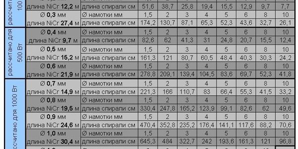 Известно было, какого диаметра провод и какая длина требуется для намотки спирали нужной мощности. Эти магические числа до сих пор можно найти в сети интернет. На рисунке показана таблица, где приведены данные о спиралях различной мощности при напряжении питания 220В.
