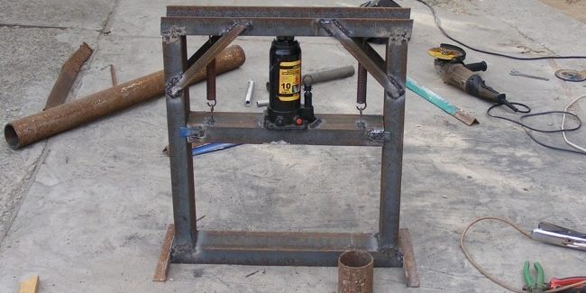 - Гидравлический пресс — гидравлику можно использовать, взяв за основу автомобильный домкрат. Закрепив его на железной раме кверху ногами, можно получить оригинальную установку для прессования.