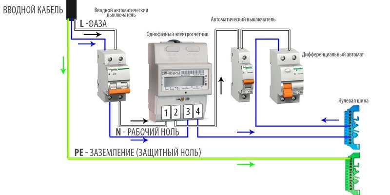 Как видите, перед электросчетчиком, необходимо установить однополюсный автоматический выключатель, так называемый «вводной автомат», в который заходит фазный провод вводного кабеля и уже из него фаза поступает в клемму «1» электросчетчика, рабочий ноль заходит сразу в клемму «3», а защитное заземление (защитный ноль) подключается напрямую к нулевой шине.