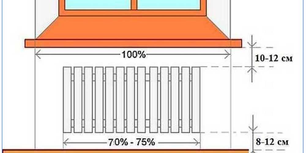 от нижней поверхности подоконника до верхней части секций 5-10 см;