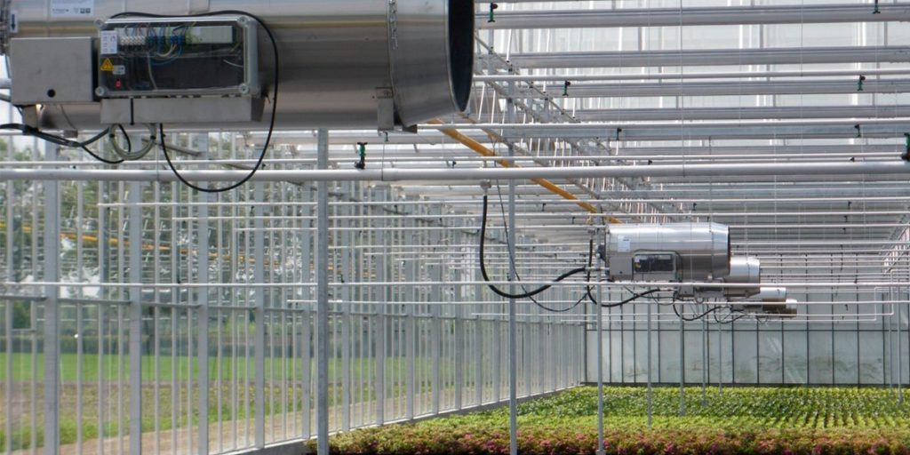 В блоках приточной вентиляции нагревающим устройством служит калорифер. Воздух проходит через него, получая тепло от циркулирующего водяного теплоносителя или нагревательного электрического элемента. Для распределения воздуха при большой площади теплицы сооружается система воздуховодов, оборудованная решетками и диффузорами.