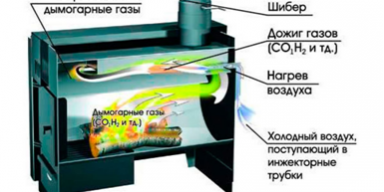 В первой камере буржуйки сгорают дрова, выделяя при этом горючий газ. Горячие дымовые газы, попадая во вторую камеру и перемешиваясь с воздухом, загораются и полностью сгорают.