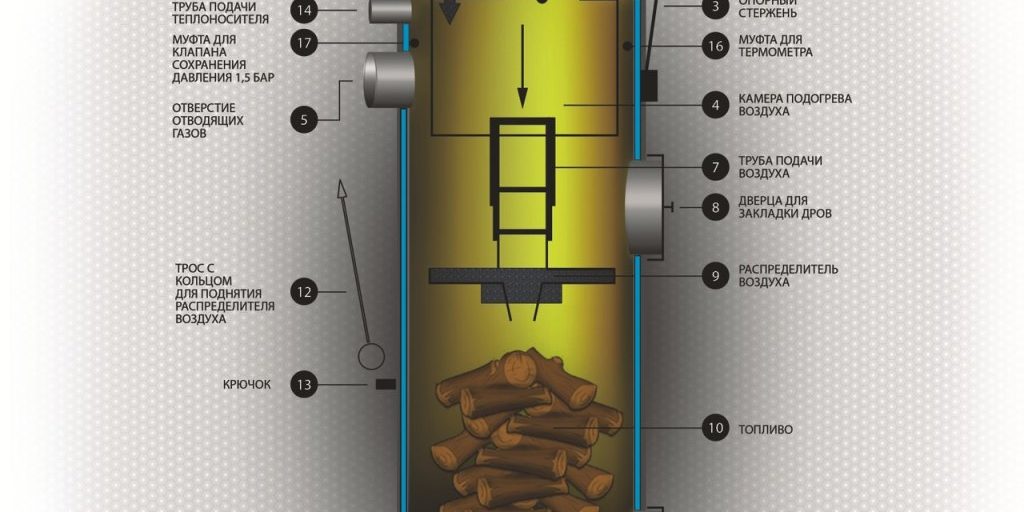 В топливную камеру воздух подается через поддувало и колосники, с помощью дверки поддувальной камеры регулируют подачу воздуха и силу горения. В зависимости от конструкции агрегаты изготавливают из листовой стали толщиной 3–5 мм или же из труб диаметром как минимум 300 мм. Сталь подойдет обычная, но лучше приобретать жаростойкую или же использовать двойной слой материала. Роль теплообменника могут выполнять как сами стенки, так и регистры, либо комбинация того, и другого.