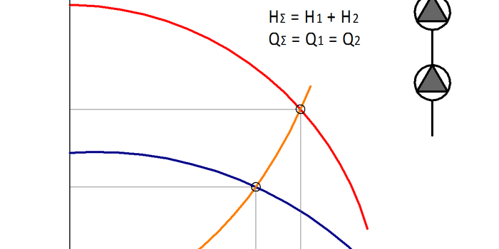 Включение насосов последовательно на практике встречается очень редко. Последовательная работа насосов используется для увеличения значения напоров (H) при одинаковом расходе (Q), и предполагает включение двух или более насосов в режим, когда все они перекачивают жидкость ступенчато в один и тот же напорный трубопровод. На (Рис. 1) показан пример последовательного подключения двух насосов и их общая напорная характеристика.