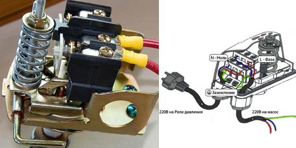 - Контактная группа реагирует на указанные действия, смыкая или размыкая контакты, тем самым передавая сигнал насосу. Схема подключения обязательно учитывает подсоединения его электрокабеля к устройству.