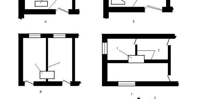 - Если при помощи печной конструкции будут обогреваться сразу два смежных помещения, то идеальным (а по совместительству и максимально эффективным) вариантом является расположение прибора во внутренней перегородке между комнатами (так, как продемонстрировано на том же изображении, пункт в).