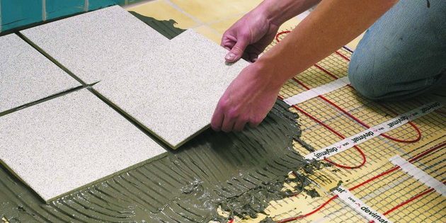 - Плиточный клей применяется в качестве тонкой стяжки для электрического теплого пола.