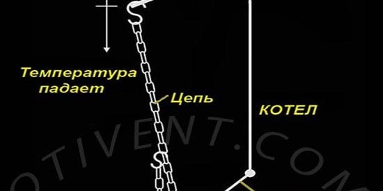 - Рычаг ослабляет цепочку, заслонка начинает закрываться и уменьшать проходное сечение. В топку поступает меньше воздуха, процесс горения замедляется.