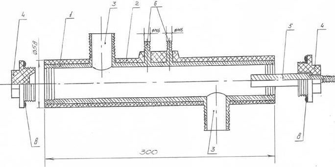 1 — железная бесшовная труба Ø57 мм с внутренней резьбой; 2 — покрытие из термостойкой краски; 3 – патрубки входа и выхода теплоносителя Ø32 мм с наружной резьбой; 4 – боковые металлические заглушки; 5 – внутренний электрод для котла Ø25 мм; 6 – присоединительные клеммы с резьбой М6 для подключения нулевого провода и заземления; 8 – прокладки из резины или паронита.