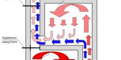 Температура выходящих дымовых газов ниже любой другой печи с плитой, так как они интенсивно отдают свое тепло стенкам печки. По этой причине дымоходы источников тепла данной конструкции требуется защищать от разрушительного воздействия конденсата. После того как протапливание закончено, тепло еще долгое время сохраняется вверху обоих колпаков даже в том случае, если главная задвижка остается открытой. Холодный воздух, поступающий через поддувало, не может подняться под свод колпака и проходит в дымоход по пути, указанному на схеме синими стрелками.