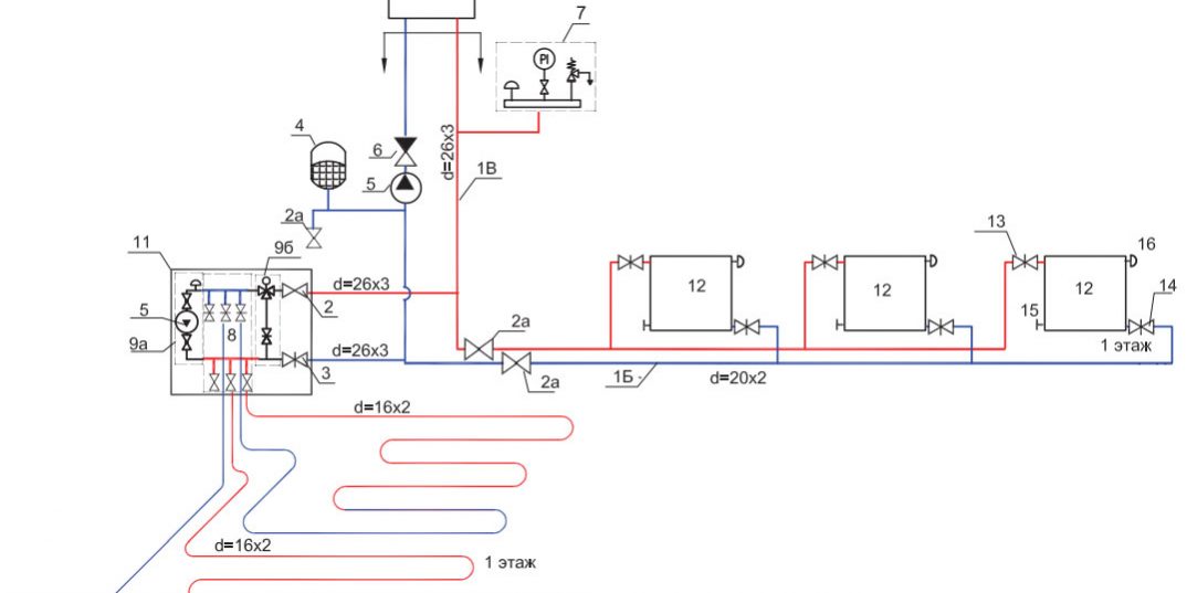 Эта схема тоже относится к комбинированным системам, когда у вас одновременно есть и радиаторы, и теплый пол.