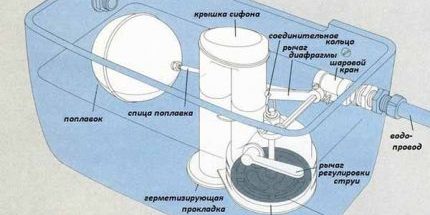 - Поплавок с рычагом, который регулирует положение мембраны в корпусе.