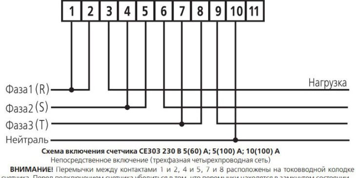 Подключение прибора учёта на 3 фазы не слишком сложно. На каждом изделии под клеммной крышкой имеется схема. Сами контакты пронумерованы цифрами от одного до восьми. Подключение, чаще всего, производится следующим образом (вход питания/выход на помещение):