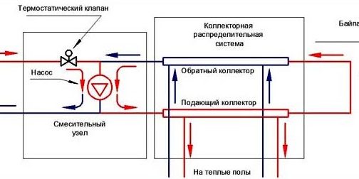 Для понижения температуры воды в системе при входе в обогревательный контур водяного теплого пола устанавливается смесительный узел, в котором имеется двухходовой или трехходовой кран. В них происходит смешивание горячего и холодного теплоносителя, поступающего из обратного контура водяного теплого пола.
