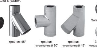 СБОР КОНДЕНСАТА И ЧИСТКА ДЫМОХОДА. Для сбора конденсата из дымохода и чистки дымохода используется «Тройник или тройник утепленный под 45 или 90 градусов» вместе с элементом «Заглушка с конденсатоотводом» или «Заглушка глухая».