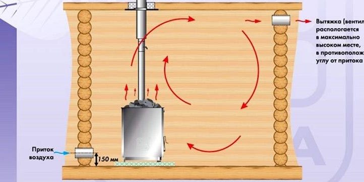 Принцип действия такого воздухообмена заключается в попадании холодного воздуха в помещение, прохождение его через печь, нагрев и циркуляцию по всей сауне.