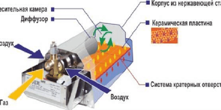 Посмотрите на рисунок, здесь показан принцип действия инфракрасного газового обогревателя. При подаче газа он поступает в диффузор, где его подхватывает поток воздуха и направляет в смесительную камеру, где формируется горючая смесь. После этого газовая смесь поступает в перфорированную пористую структуру керамической пластины. После подачи искры от пьезоэлемента смесь в отверстиях воспламеняется и передает тепловую энергию керамическому элементу.